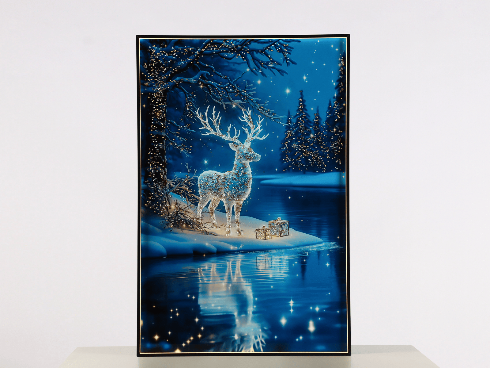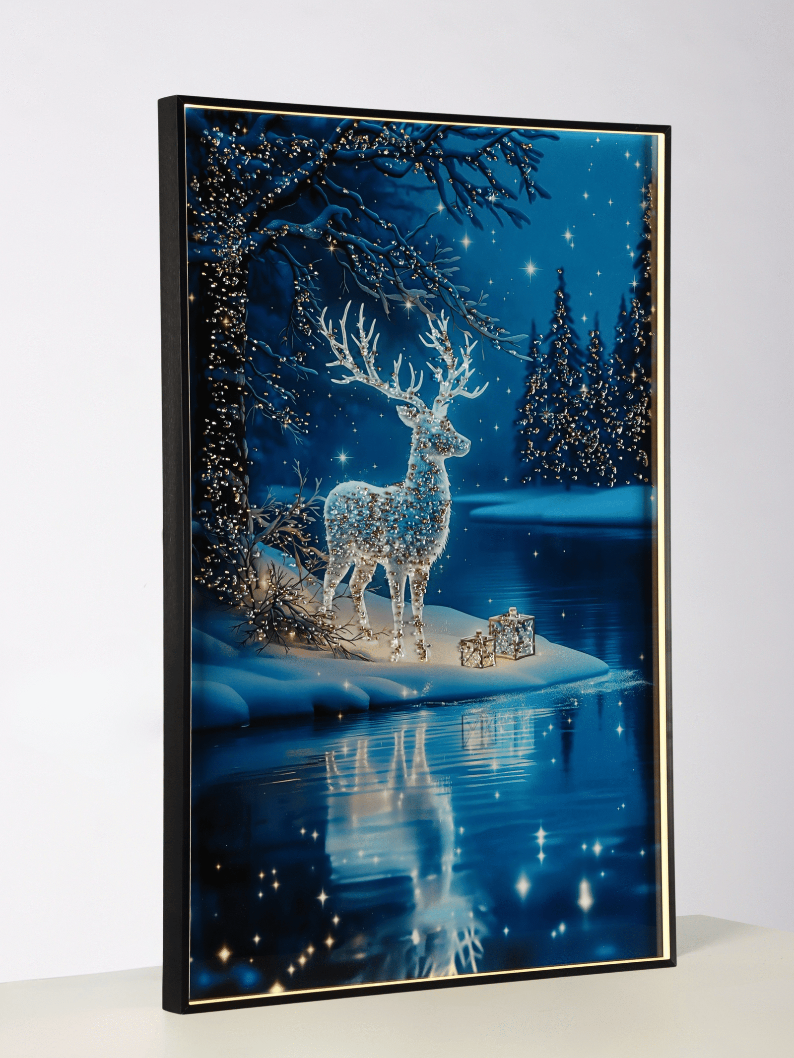 • تقنية LUMINA Glow: تعمل الإضاءة المدمجة على إبراز النجوم المتناثرة في السماء والهدايا المضيئة، مما يحول اللوحة إلى مصدر لـ “الضوء الفني” الذي يدفئ أركان المجالس والقصور.