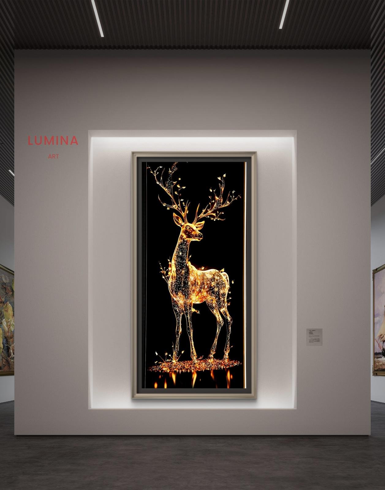 انعكاسُ القوةِ الناري: تبرز أسفل الأيّل انعكاسات ضوئية تشبه ألسنة اللهب الذهبية، مما يعزز من حضور اللوحة كقطعة فنية “ديناميكية” تتفاعل مع زوايا النظر المختلفة.