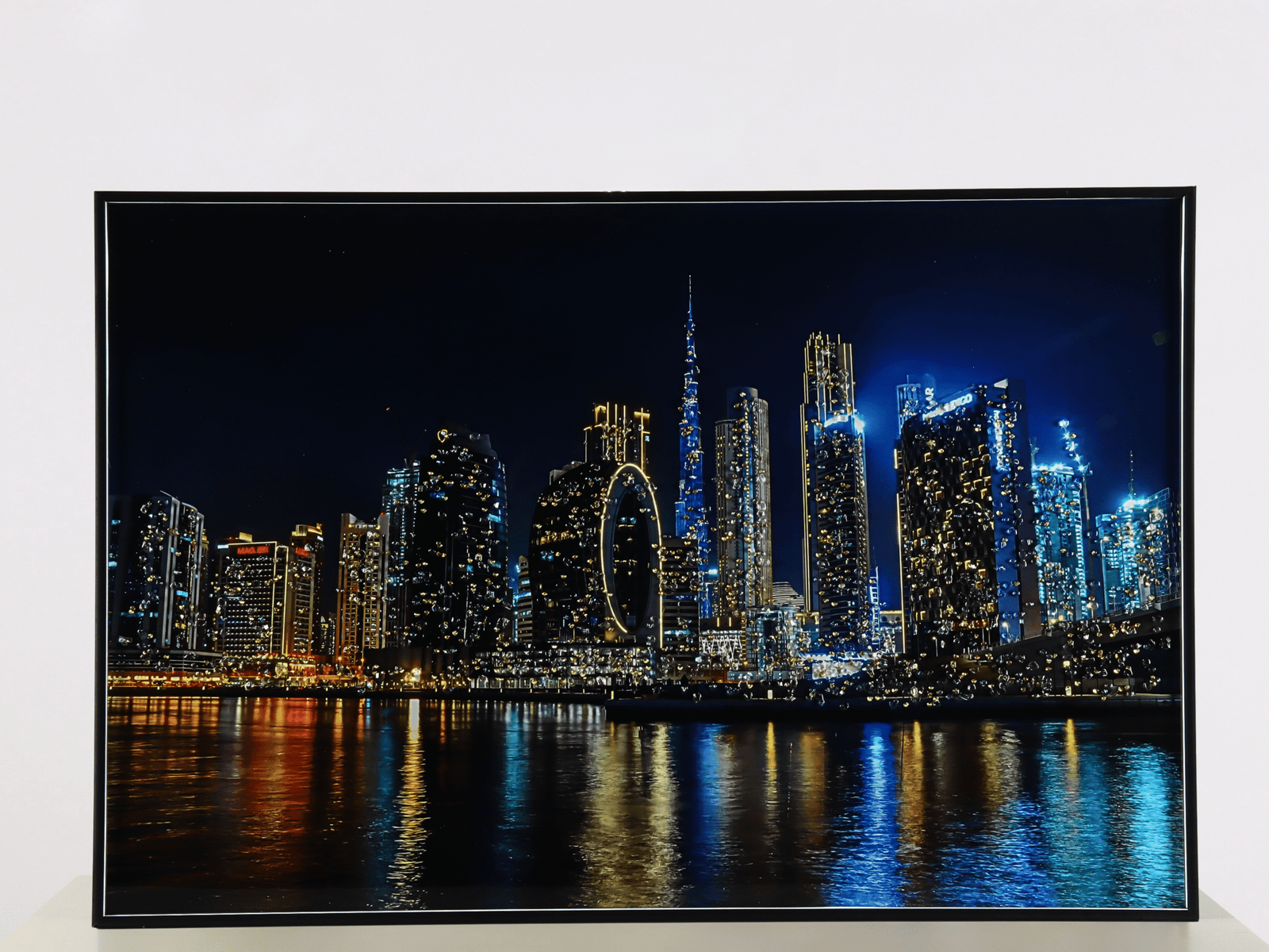 تقنية LUMINA Glow: زُودت اللوحة بنظام إضاءة خلفي متطور يبرز التباين المذهل بين ليل المدينة العميق وانعكاسات الأضواء الذهبية والزرقاء على سطح الماء.