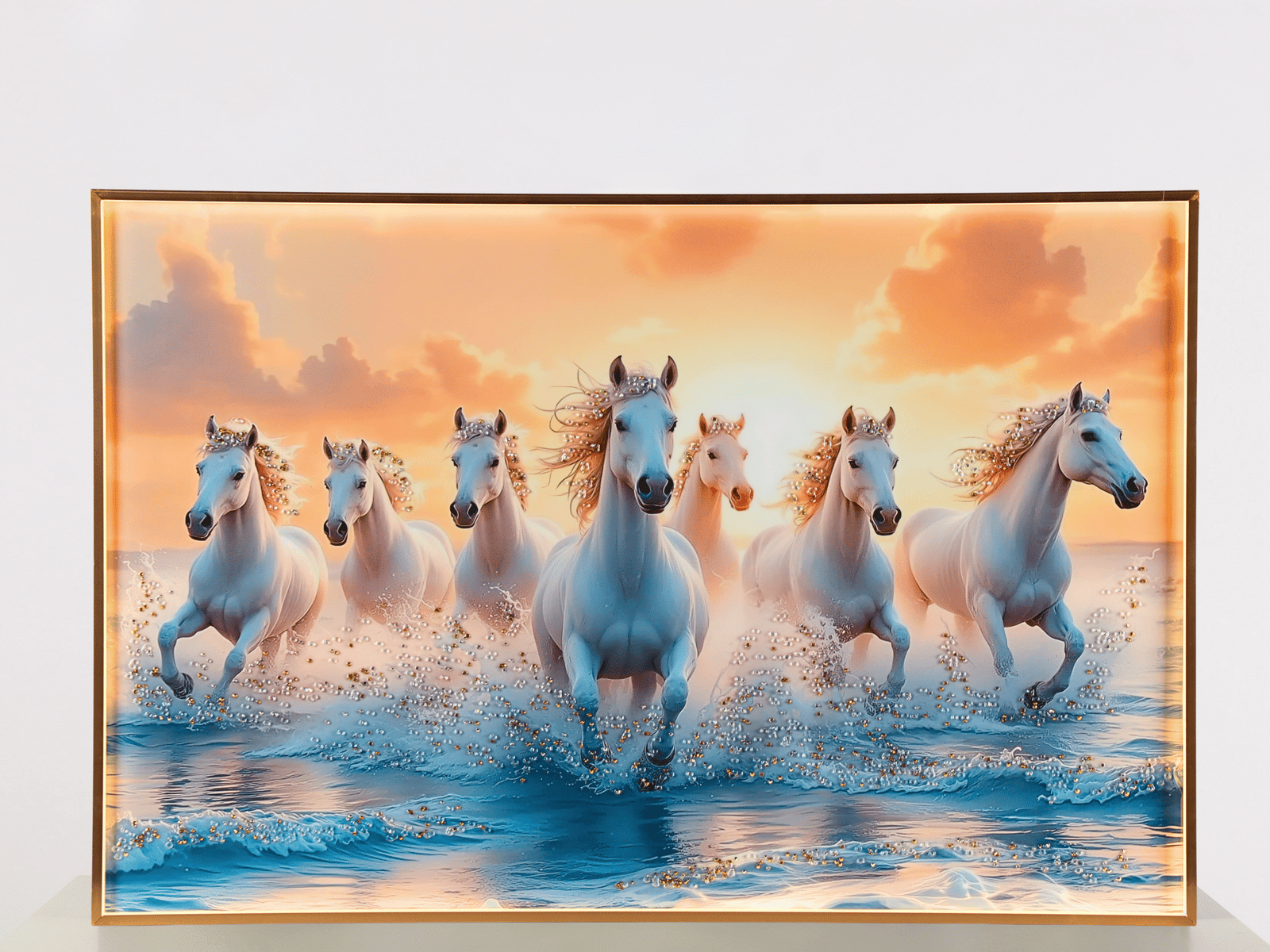 إطارُ النورِ الخفي: كما هو معهود في مجموعتنا، تأتي اللوحة بتقنية الإضاءة المحيطية التي تبرز عمق الألوان وتجعل الخيول تبدو وكأنها تخرج من إطارها لتملأ الغرفة بالحياة.