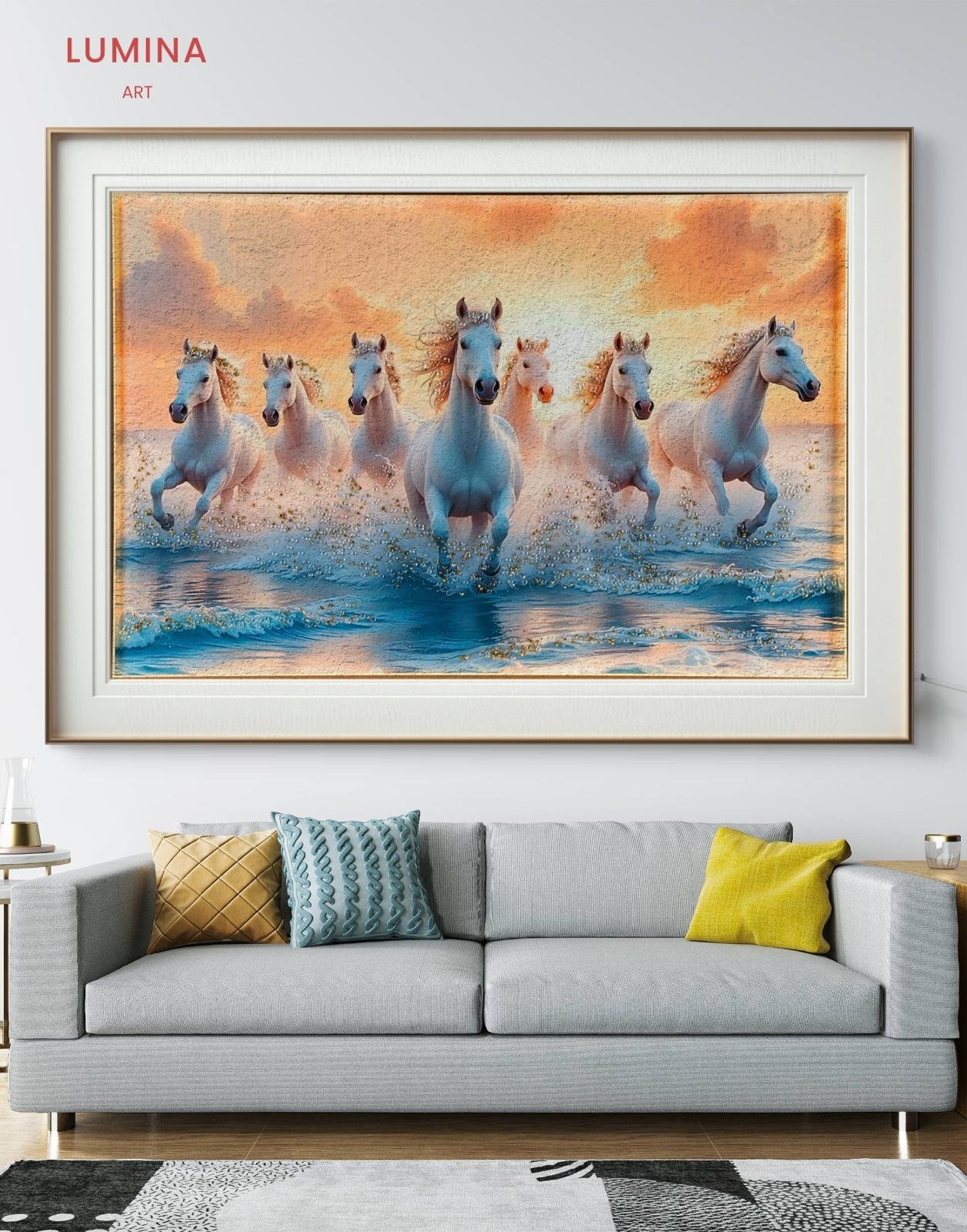 لماذا تقتني هذه القطعة؟ لأن الخيل هو رمز العزة والريادة، واجتماع سبعة خيول في لوحة واحدة من LUMINA يرمز إلى الكمال والنجاح، مما يجعلها القطعة الأنسب لمن يبحث عن ديكور يجمع بين الهيبة الفنية والروح الإيجابية.