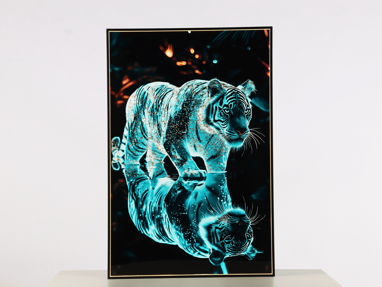 انعكاس مرآوي: تتميز اللوحة بتأثير الانعكاس السفلي الذي يعزز من عمق الصورة، وكأن القطعة الفنية تطفو في عالم من الأحلام الضوئية.