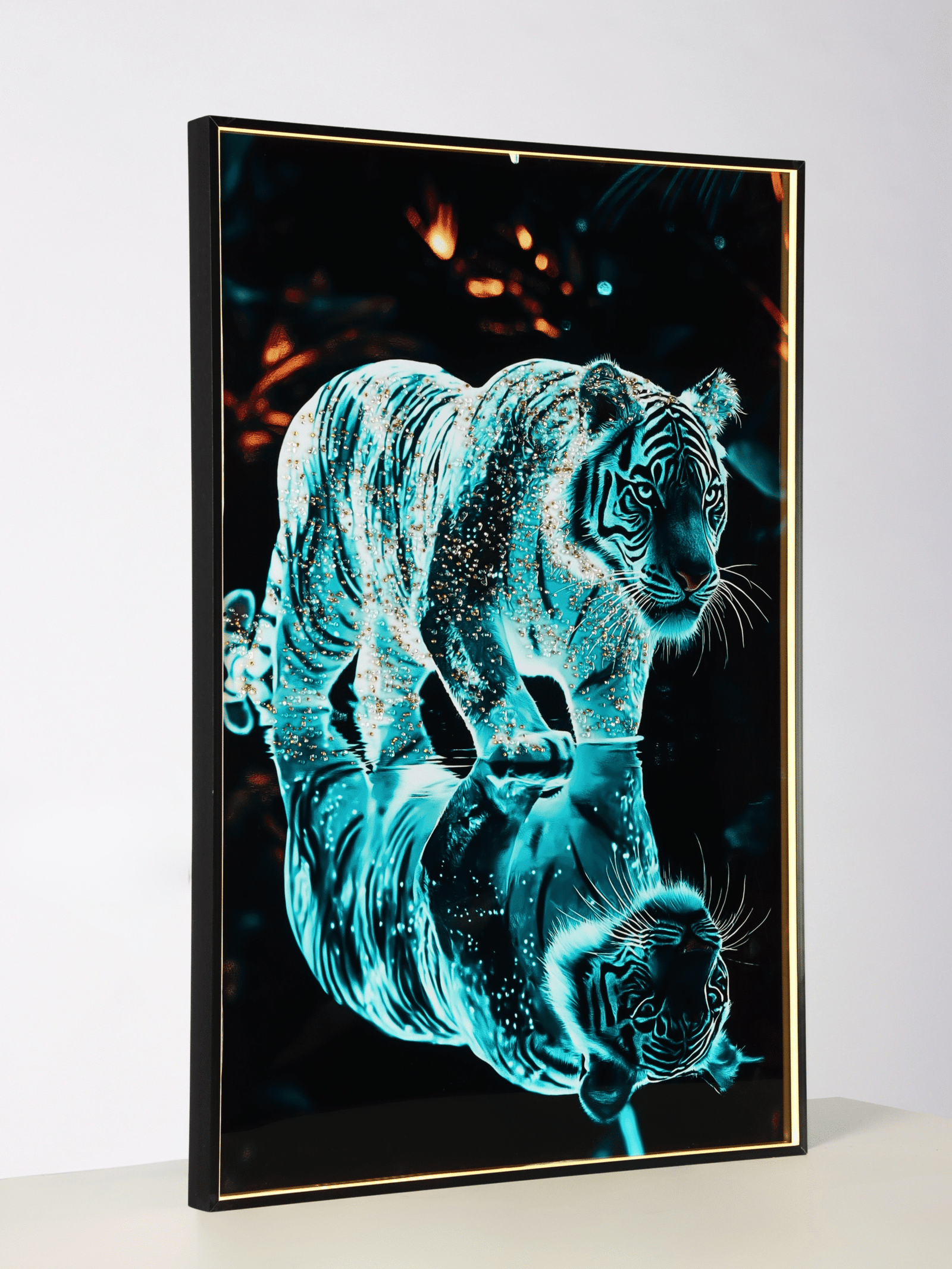 تحفة فنية مصاغة من البورسلين المصقول، مرصعة ببريق الكريستال ونقاء الألماس. تتوهج بهيبةٍ ملكية عبر إضاءة LED مدمجة، لتمنح تفاصيل النمر بُعداً حياً يتنفس نوراً وفخامة.